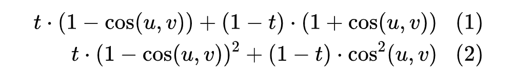 这是因为,通常文本匹配语料中标注出来的负样本对都是“困难样本”,常见的是语义不相同但字面上有比较多的重合。此时,如果我们用式(1)作为损失函数,那么正样本对的目标是 1、负样本对的目标是 -1,如果我们用式(2)作为损失函数,那么正样本对的目标是 1、负样本对的目标是 0。