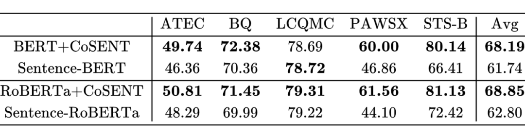 笔者在多个中文数据集上对 CoSENT 进行了实验,分别比较了在原有训练集上训练以及在 NLI 数据集训练两种方案,大多数实验结果都表明 CoSENT 明显优于 Sentence-BERT。测试数据集同《无监督语义相似度哪家强?我们做了个比较全面的评测》 ,每个数据集都被划分为 train、valid、test 三部分,评测指标是预测值和标签的 spearman 系数。