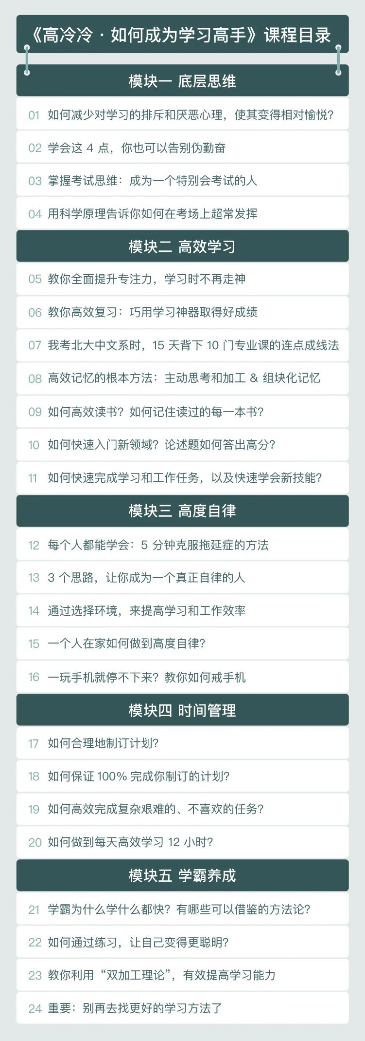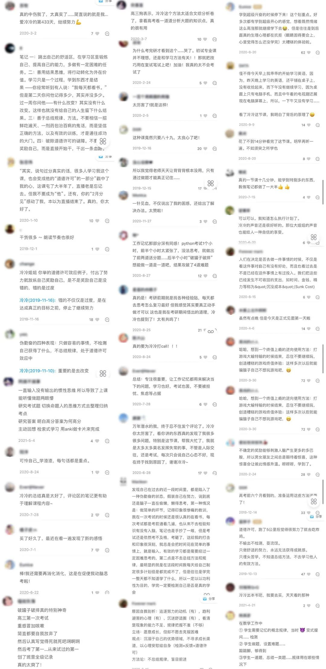 专栏通读下来,说 10 倍提升你的学习效率,毫不夸张。除了上面列的实用学习技巧,冷冷还把高手学习的 4 个底层思维、让学习速度“开挂”的高效记忆法、自律到骨子里的 9 大精力管理法则等,都毫无保留地分享出来,这种精神,很难得。