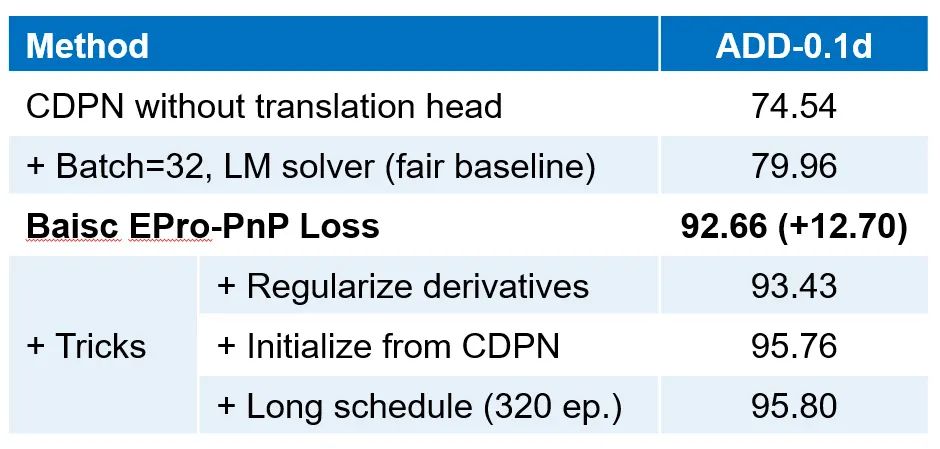 使用 LineMOD 数据集实验,并严格与 CDPN baseline 进行比对,主要结果如上。可见,增加 EPro-PnP 损失进行端到端训练,精度显著提升(+12.70)。继续增加导数正则化损失,精度进一步提升。在此基础上,使用原版 CDPN 的训练结果初始化并增加 epoch(保持总 epoch 数与原版 CDPN 的完整三阶段训练一致)可以使精度进一步提升,其中预训练 CDPN 的优势部分来源于 CDPN 训练时有额外的 mask 监督。
