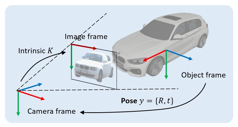 我们研究的是 3D 视觉中的一个经典问题:基于单张 RGB 图像定位其中的 3D 物体。具体而言,给定一张含有 3D 物体投影的图像,我们的目标是确定物体坐标系到相机坐标系的刚体变换。这一刚体变换被称为物体的位姿,记作 y,其包含两部分:1)位置(position)分量,可用 3x1 的位移向量 t 表示,2)朝向(orientation)分量,可用 3x3 的旋转矩阵 R 表示。