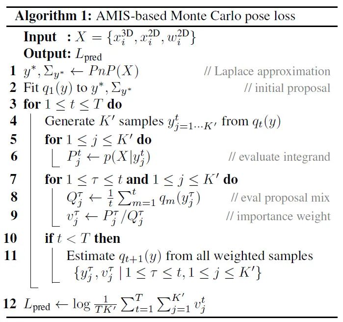 具体而言, 我们采用了一种重要性采样算法一-Adaptive Multiple Importance Sampling (AMIS), 计算出K个带有权重 的位姿样本 , 我们将这一过程称作蒙特卡洛 PnP: