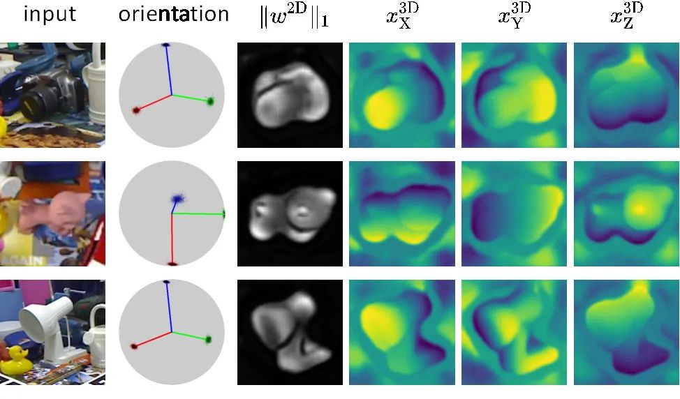 上图显示了用 EPro-PnP 训练的稠密关联网络的预测结果。其中,关联权重图 对图像中的重要区域进行了高光,类似于 attention 机制。由损失函数分析可知,高光区域对应的是重投影不确定性较低以及对位姿变动较为敏感的区域。