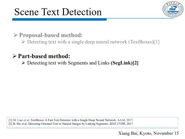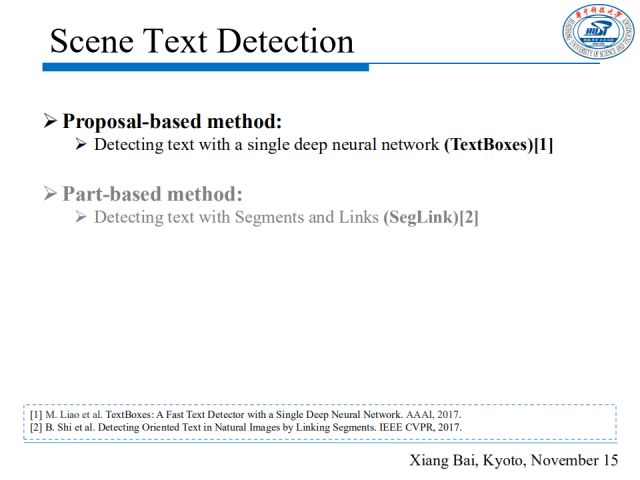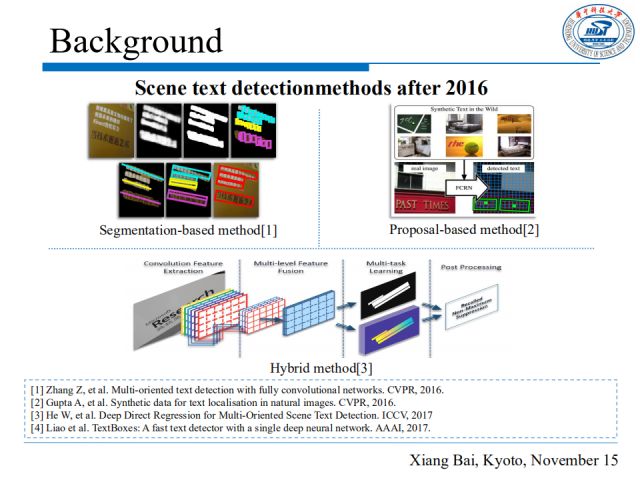 其三是混合思想,它采用多任务学习的框架,结合了分割和边界框检测的方法。代表性的工作是发表在ICCV2017的“Deep Direct Regression for Multi-Oriented Scene Text Detection”。
