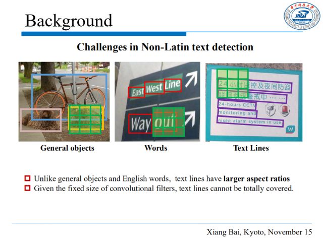 区别于普通的物体和英文单词,文本行具有更大的高宽比,对于普通的卷积核,文本行不能被完全覆盖。这意味着现有基于深度学习的目标检测方法并不能很好适用于场景文本检测。