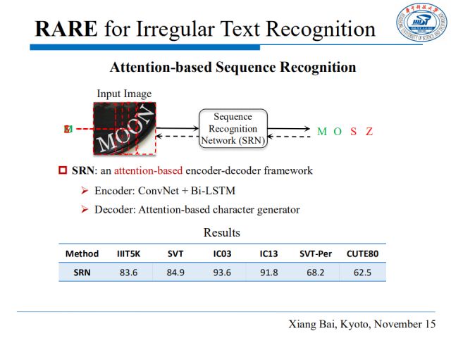 SRN包含一个编码器和一个解码器。编码器由一个ConvNet和一个Bi-LSTM组成,用来生成特征序列表达,解码器是一个基于注意力机制的字符生成器,根据输入序列循环地产生字符序列,根据每一步的注意力机制来解码相关内容,上图展示了SRN在各数据集上的识别精确度。