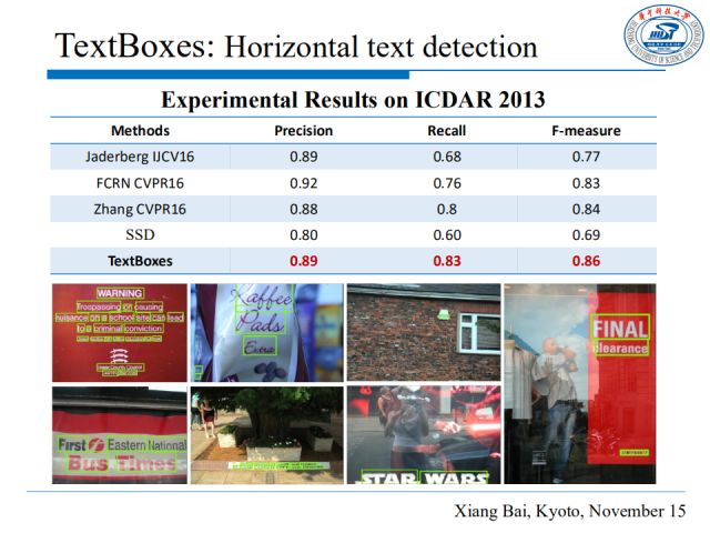 由上表可以看出,TextBoxes明显优于SSD并且在ICDAR2013数据集上达到了state-of-the-arts的效果,这个数据集主要由包含水平文本的图片构成。