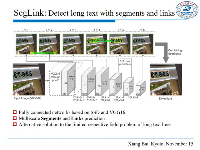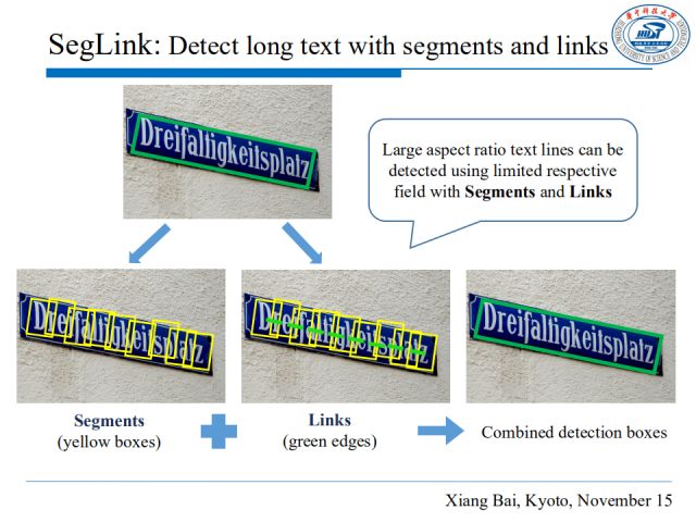 接下来介绍基于部件的方法SegLink,它的核心思想是将文本行分解成两种可检测的元素:定义为部件(segment)和关联(link)。部件是指文本行的一部分(图中黄色部分),关联是指连接两个相邻部件的联系(图中绿色短线),被关联表明其属于同一单词或者文本行。 基于segments和links,整个文本行可以通过一个简单的组合表达出来。因为Segments和Links不涉及感受野问题,所以这个思路可以处理长文本行。