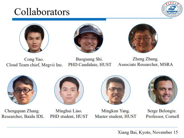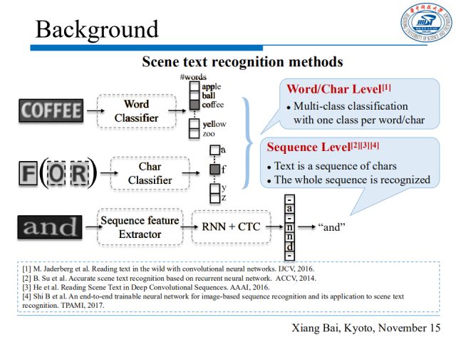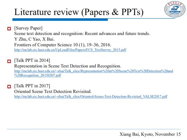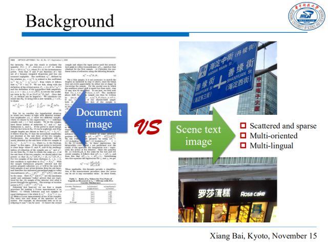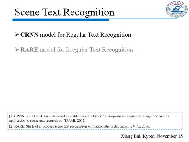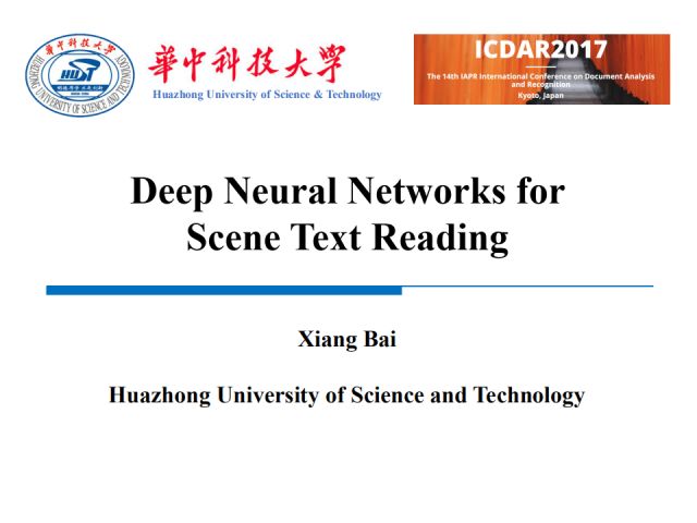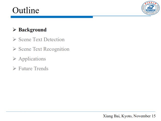 我的报告分为五个部分。首先,回顾近来用于场景文本理解的深度学习方法;然后介绍我们在场景文本检测和识别方面的最新工作;最后介绍一些场景文本理解的应用和我对领域趋势的认识。