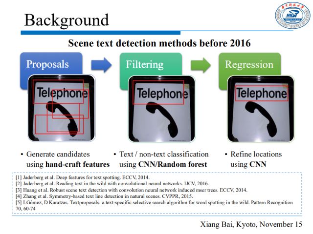 在2016年以前,大多数场景文本检测工作有三个步骤:首先,利用手工设计特征生成候选框;然后,利用二分类卷积神经网络或随机树来进行文本/非文本区域的分类,即过滤掉误检的候选框;最后,利用CNN来修正区域定位,以得到较精确的回归结果。