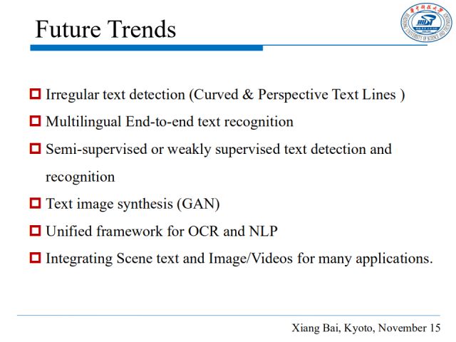 未来我们将更加着眼于以下几个方面:不规则文本的检测,比如针对弯曲的或者多视角下的文本行;端到端的多语言文本识别;半监督或弱监督的文本检测识别;基于生成对抗网络的文本图像合成;针对文本识别或自然语言处理的框架;场景文本和图像/视频的结合,以应用到更多的实际场景中去。