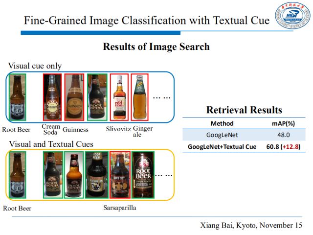 我们也将学习到的融合特征用于图像检索,如图,只用视觉信息可能会因为其差别过小引起误分类,而加入文本信息后,酒瓶图片检索的mAP提升了12.8%。