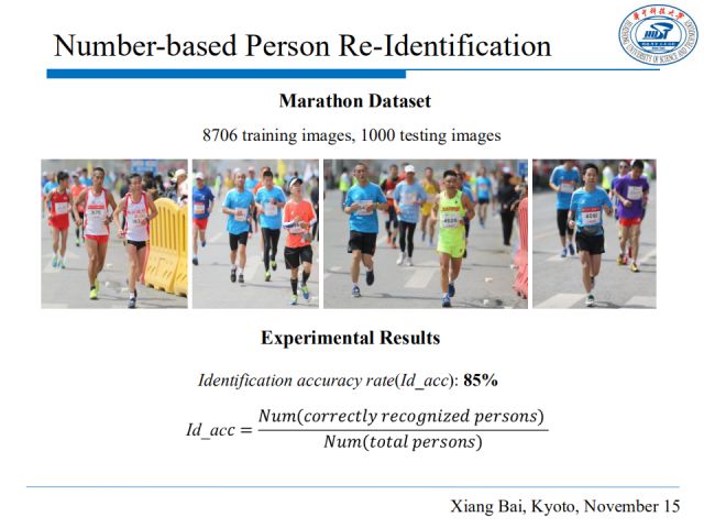 我们在自己收集的一个马拉松数据集上验证了这个基于号码牌的行人重识别方法,Marathon数据集包含8706张训练图片和1000张测试图片,经测试行人重识别正确率为85%,从某种程度上讲它可以帮助人们进行搜索,还能有效减少搜索时间。
