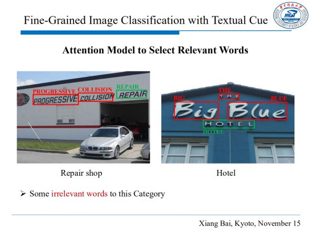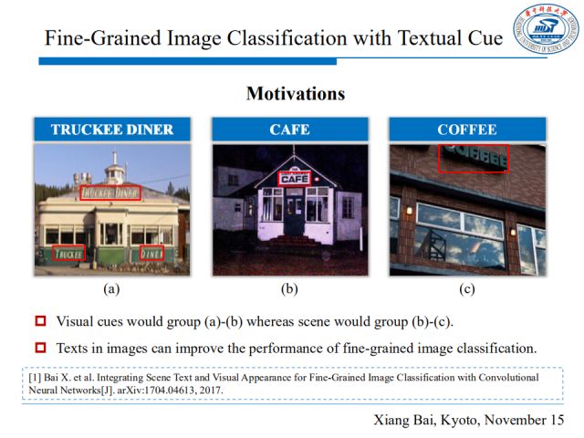 通常,只用图片直观的视觉信息是不足以进行细粒度图像分类的,如上图,看上去(a)和(b)是类似的,而实际上,(b)和(c)描述的是同一场景,且与(a)大不相同。我们仔细观察,(b)(c)中分别包含了语义相近的词“cafe”和“coffee”,这其实可以在图片仅有微小视觉差异的情况下帮助我们进行细粒度的图片分类。