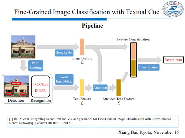 整个端到端的算法流程如上图所示。首先使用一个已有的文本识别框架来提取出文本,然后通过word embedding提取这些文本的特征,同时,GoogLeNet对输入图片提取1024维视觉特征向量,为了消除文本中的噪声,我们又添加了一个注意力模型对提取出的文本分配权重,最后将视觉特征和文本特征基于一定的权重组合起来,利用多模态融合特征进行最终的分类。
