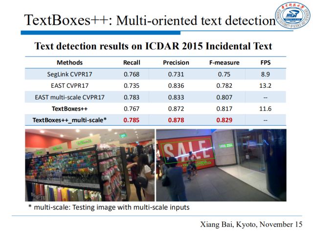 我们在ICDAR2015数据集上验证了我们的算法,实验表明,TextBoxes++达到了state-of-the-art的性能。