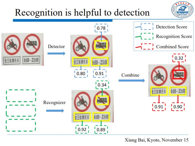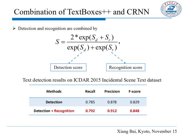 我们对检测得分和识别得分求取调和平均值,最终从ICDAR2015上的实验结果看出,这种组合有效提高了文本检测的效果。