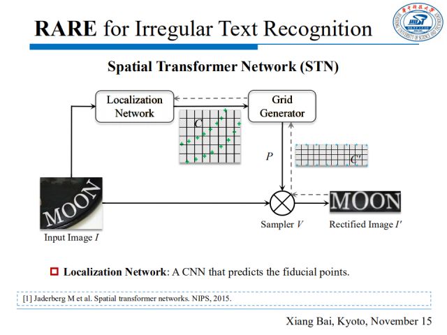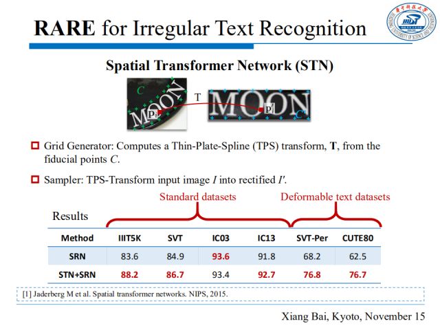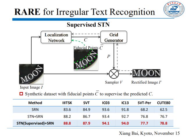 网格生成器估计TPS变换的参数,并产生一个采样网格。如上图,原图中基准点是C,修正后图中定义基准点为C’,网格生成器计算TPS变换的参数T,采样器将原图I 修正为I’。上表显示,相比于单独使用SRN,添加STN可以大幅度提高识别效果,特别是对于一些有形变的文本数据集。