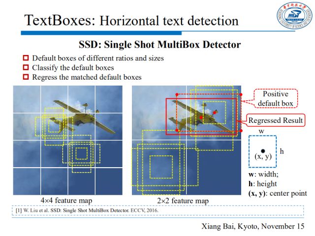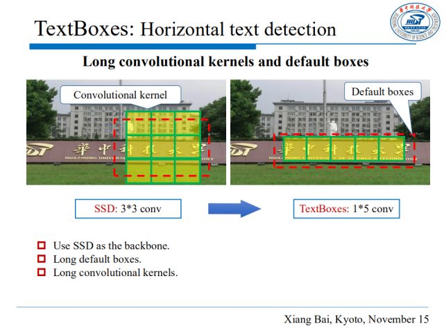 TextBoxes方法采用SSD作为基础框架,首先在设计默认框(Default Box)时,采取多比例大小的框(包含长条形状的框)。TextBoxes方法对SSD的卷积核也进行了改进,因为文本行往往比普通物体更长,常用卷积核并不能和文本行很好匹配,因此这里将1*1或3*3的卷积核更换为适合文字的长条形卷积核。
