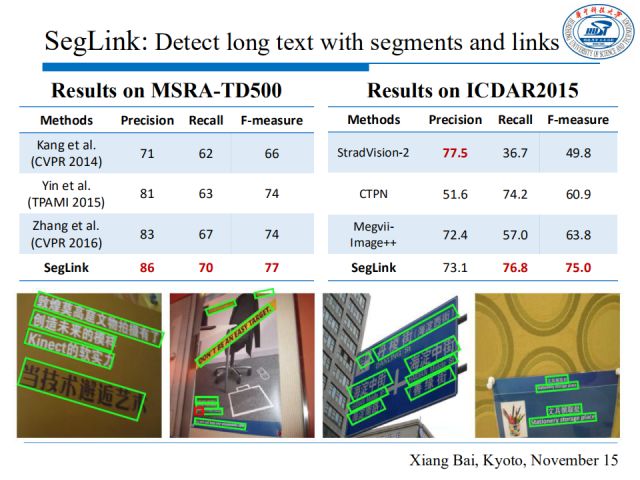 从在MSRA-TD500和ICDAR2015两个数据集上的测试结果来看,我们的SegLink方法对方向不确定的文本行和中英混合的文本都有较好的检测性能。