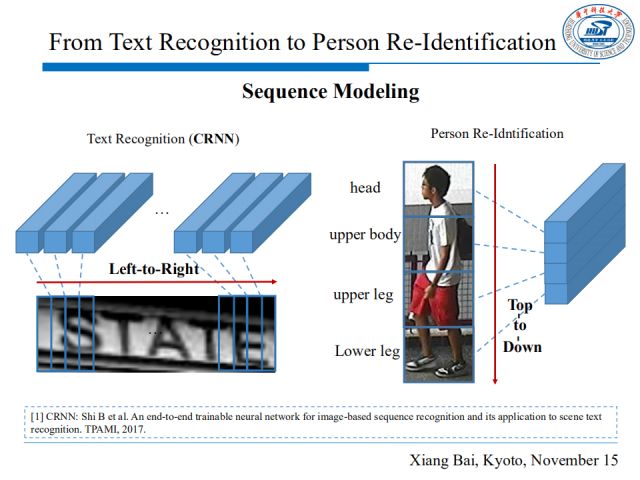 我们发现了一个很有趣的类比思想,将水平文本行看作一个从左到右的序列可以取得很好的识别效果,那么受此启发,我们可以将行人看作一个从上到下分块的序列进行重识别。