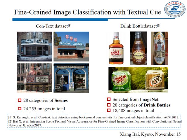 为了验证算法的有效性,我们在两个数据集上进行了测试,一个是办公场所建筑数据集Con-Text,它包含28种场景,共24,255张图片。另一个是饮料瓶数据集Drink Bottle,它选自ImageNet数据集,含有20种饮料瓶共18,488张图片。这两个数据集图片都包含了文本,且不同种类间只有很小的视觉差异。