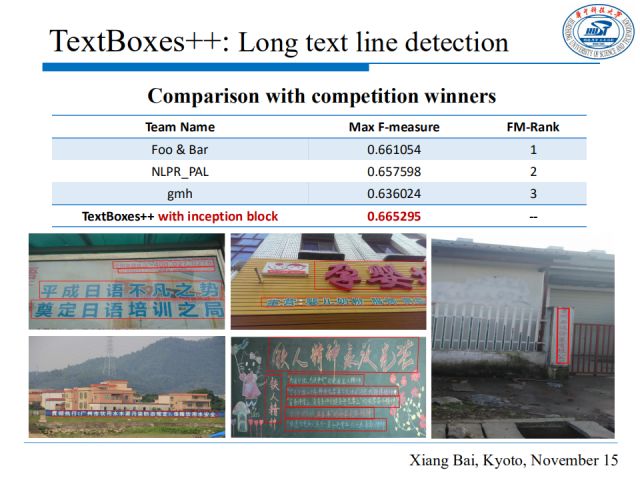 我们也在整个RCTW数据集上进行了测试,通过和曾在比赛中获胜的其他团队方法进行比较,可以看出我们结合inception block的TextBoxes++方法达到了最高的F值。