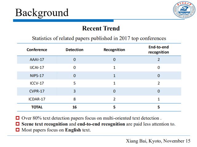 从“场景文本理解”相关文章在2017年顶会中统计数据来看,超过80%的文章聚焦多方向文字检测,而对场景文本识别和端到端识别的关注度相对较低,且大多数文章集中于解决英文文本问题。