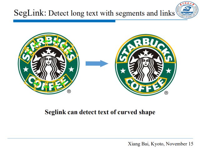 事实上,SegLink不仅能够处理长文本行,还可以很好地检测弯曲排列的文本行。如图,星巴克的logo字母是弯曲排列的,而SegLink可以灵活地适应它的文本形状。