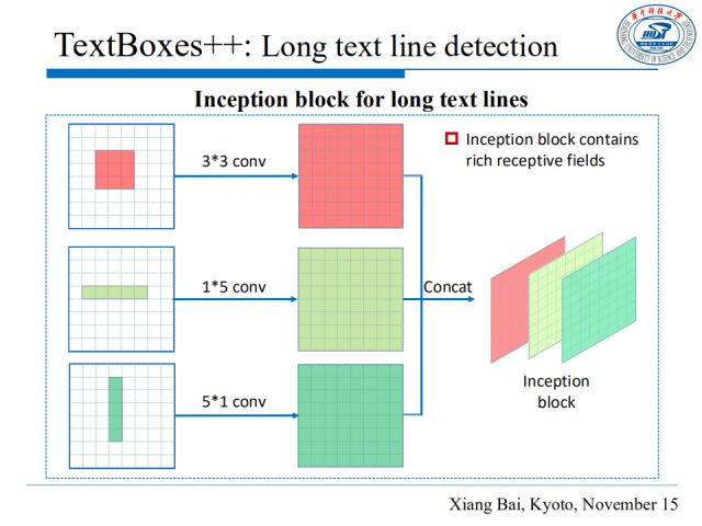 在非拉丁文本检测中,为了克服长文本行的较大比例变化,我们引入一些策略:首先改变卷积核尺度,比如使用长条形卷积核;然后为了增大感受野范围,我们采用类似于inception的模块,组合不同卷积核产生的特征图。此外,使用基于部分的模型也是一种很好的选择,但这就需要把文本行中相邻的部分进行分组。