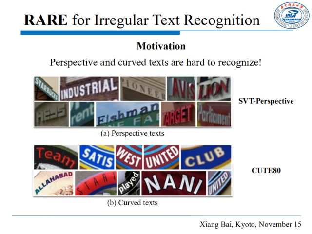 如图,由于拍摄视角的变化、文字曲形的排列方式等因素影响,自然场景图片中的文本形状常常是不规则的,如图中SVT-Perspective和CUTE80数据集所示,这就给识别造成了极大的困难。CRNN可能对此类情形并不奏效,它是在输入文本水平的前提下提出来的,因此我们提出了RARE。