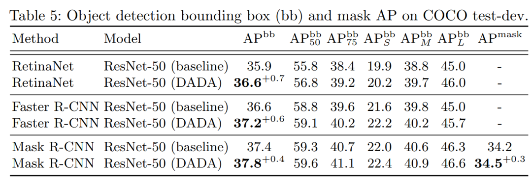 除此之外,我们也将数据增广训练的ImageNet模型作为目标检测的预训练模型,也提升了RetinaNet、Faster R-CNN和Mask R-CNN的性能。后续工作将尝试直接将我们的算法直接应用到目标检测任务上。