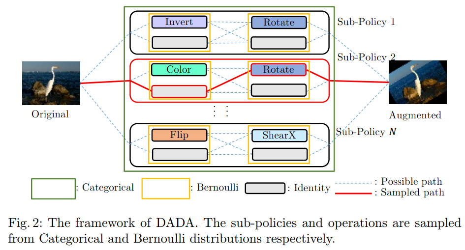 1. 我们首先将数据增广策略搜索形式化为对105个sub-policies的categorical-distribution采样问题,对sub-policies里每个操作的概率作为bernoulli-distribution采样问题。