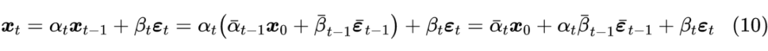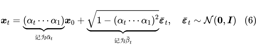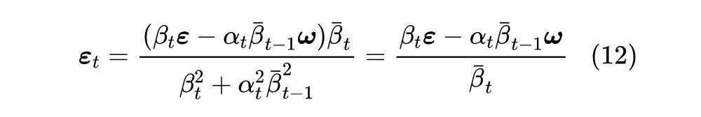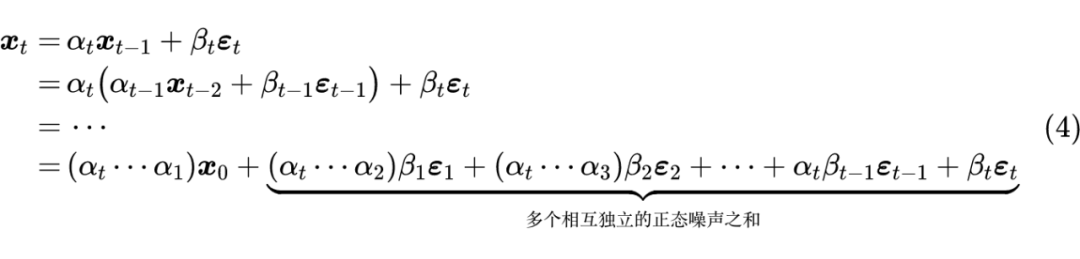 然后,我们利用一个概率论的知识——正态分布的叠加性,即上述多个独立的正态噪声之和的分布,实际上是均值为 0、方差为