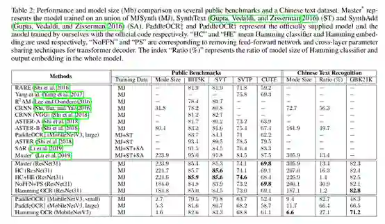 场景文本识别中很多模型都使用了笨重的模型,这些模型很难在移动端设备上部署。这也是最近大火的Paddle OCR使用CRNN实现其超轻量级识别模型的原因。PaddleOCR采用的策略就是暴力削减特征通道来减小模型,但是这样使得性能大幅度下降。最近在arXiv上公开的Hamming OCR提出了Hamming Embedding和LSH局部敏感哈希分类的算法,大幅度削减模型大小,同时保留模型能力。