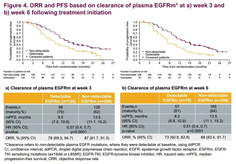 周彩存教授发布的最新研究结果来自FLAURA研究探索性分析,对EGFR敏感突变采用EGFR-TKI作为一线治疗的患者,在基线、治疗开始后第3周和第6周通过数字PCR进行血浆EGFR基因突变检测分析。将EGFR清除定义为在第3周或第6周ctNDA中检测不到EGFR敏感突变(患者在基线时ctNDA中可检测到EGFR敏感突变),基于EGFR敏感突变的早期清除评估患者的PFS。