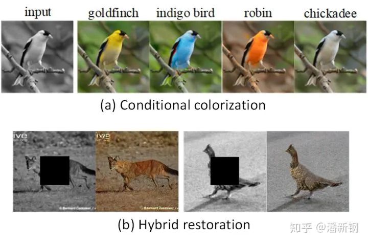 此外,DGP可以有更加灵活的应用,例如下图中的条件上色和混合复原。条件上色即在灰度空间重建时对生成器输入不同的类别条件,最终恢复的颜色会呈现出不同的效果。混合复原即同时进行多种图像复原任务,例如下图(b)中同时进行上色,补全,和超分辨率(两倍放大)。