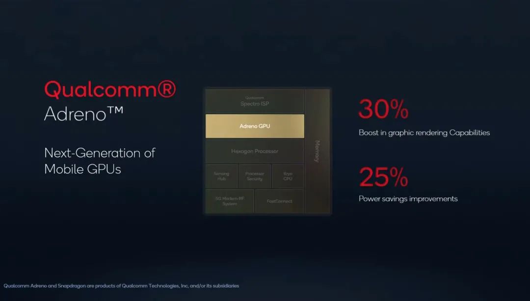 骁龙 8 Gen 1 搭载了新一代 GPU——但没有具体的名字,此前的跑分显示其型号为 Adreno 730。高通表示,新一代 GPU 峰值性能提升 30%,与骁龙 888 同等性能下能耗降低 25%,如果数据准确的话,接下来的安卓旗舰性能还是值得期待的。