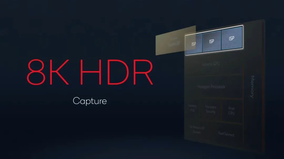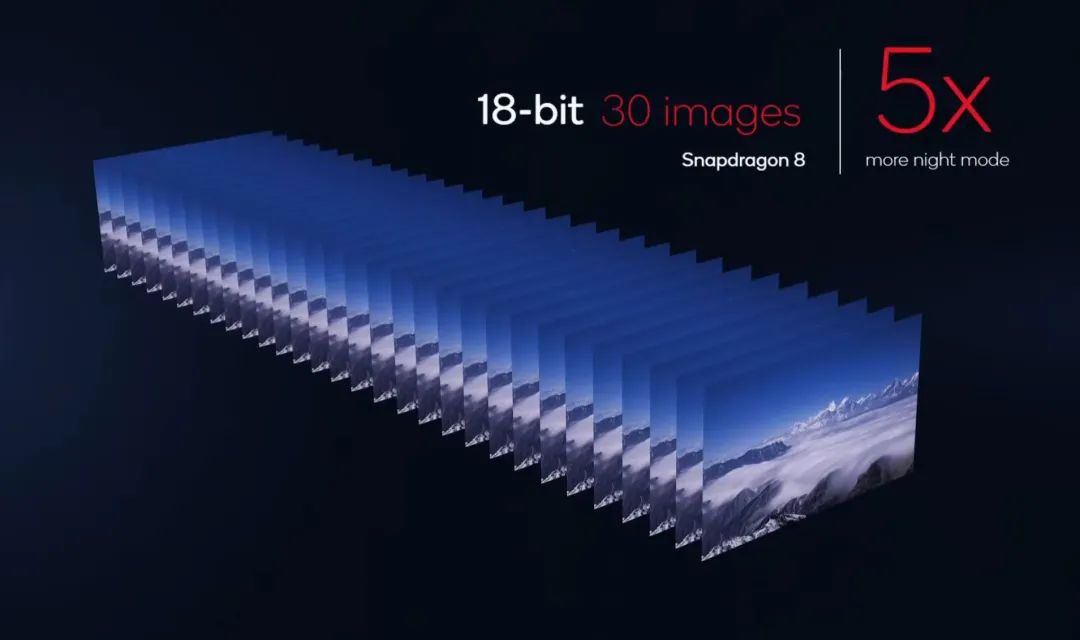 骁龙 8 Gen 1 的 ISP 从上代的三通道 14 位升级至三通道 18 位,可处理的数据量提升至 4096 倍,每秒可捕捉 32 亿像素,并支持同时处理三个 3600 万像素摄像头视频流。它还支持通过一次拍摄 30 张照片(上代为 6 张)进行合成,提升夜拍质量。