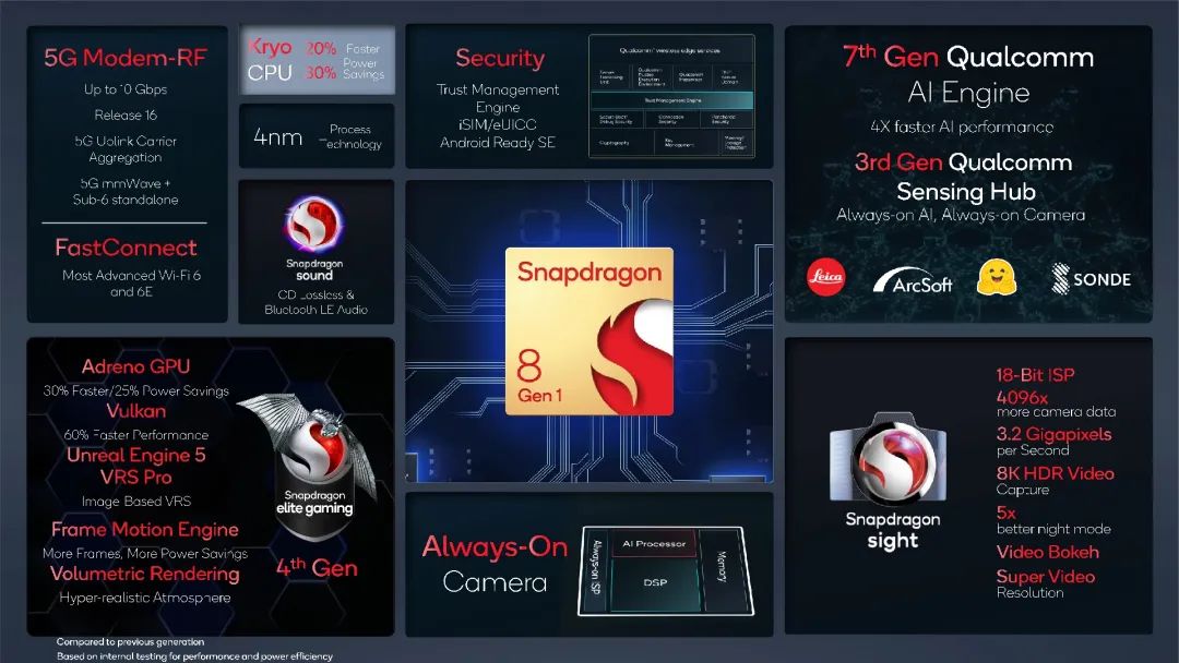 新一代骁龙 8 Gen 1 基于三星 4nm 工艺制程,带来了全新升级的 CPU、GPU、NPU,以及 X65 5G Modem 等。