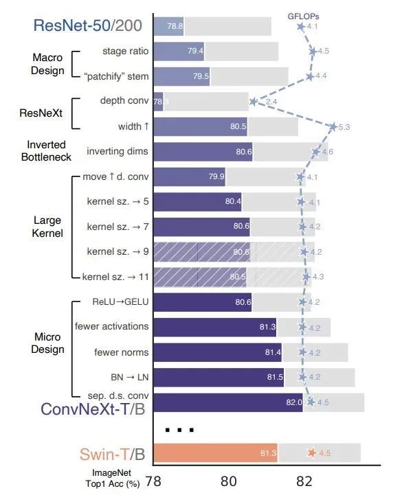 由于Swin-T中使用了7x7卷积核,这一步主要是为了对齐比较。又因为inverted bottleneck放大了中间卷积层的缘故,直接替换会导致参数量增大,因而作者把dw conv的位置进行了调整,放到了反瓶颈的开头。最终结果相近,说明在7x7在相同参数量下效果是一致的。