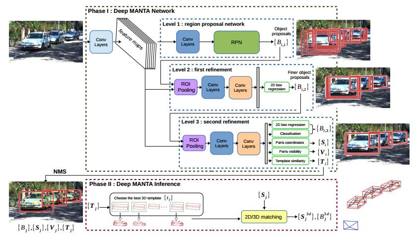 一个鲁棒的神经网络在这里被用来同时进行车辆检测,局部定位,视觉可视化和三维估计。它的架构基于一个新的粗到精的物体检测网络以提升车辆检测的准确度。与此同时,Deep MANTA网络可以在图像中定位车辆。即使车辆是不可见的。在推断过程中,网络的输出作为一个鲁棒的实时位姿估计算法的输入,来进行姿态估计和三维车辆定位。