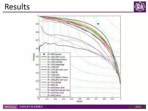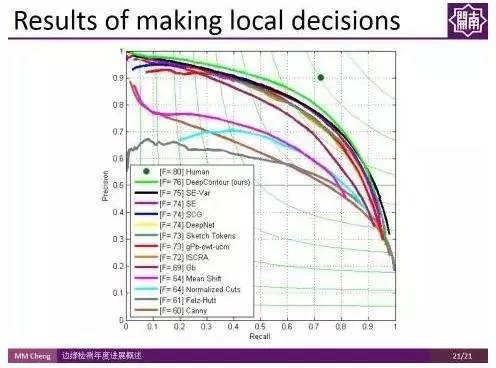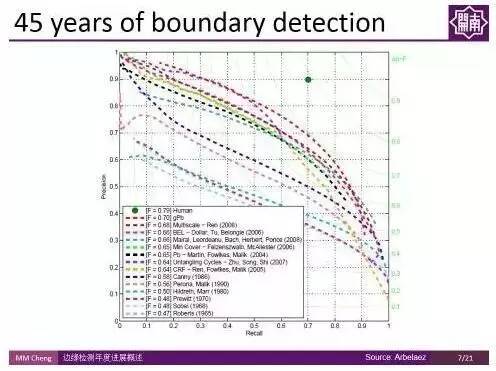 上图展示了过去45年间特别有代表性的工作在 Berkekey Segmentation Benchmark 上的PR(Precision-Recall)曲线。右上角绿色点是人类表现的均值,F-Measure值在0.8左右。