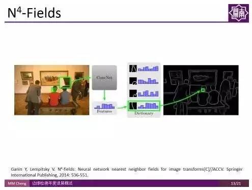 如何从一张图片里面找边缘?我们会想到计算局部梯度的大小、纹理变化等这些直观的方法。其实N4-Fields这个方法也很直观,图像有很多的patch,用卷积神经网络(CNN)算出每个patch的特征,然后在字典里面进行检索,查找与其相似的边缘,把这些相似的边缘信息集成起来,就成了最终的结果,可以看到,由于特征更加强大了,结果有了较好的提升。