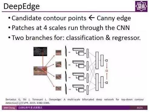 发表在CVPR 2015的DeepEdge对上述工作进行了扩展,首先使用Canny edge得到候选轮廓点,然后对这些点建立不同尺度的patch,将这些 patch 输入两路的CNN,一路用作分类,一路用作回归。最后得到每个候选轮廓点的概率。