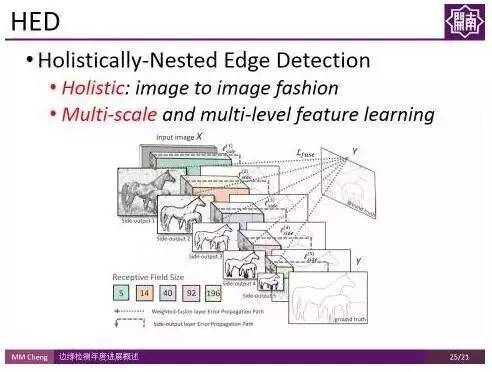 但这些特征很难模拟较为复杂的场景,如伯克利的分割数据集(Berkeley segmentation Dataset),仅通过亮度、颜色变化并不足以把边缘检测做好。2013年,开始有人使用数据驱动的方法来学习怎样联合颜色、亮度、梯度这些特征来做边缘检测。当然,还有些流行的方法,比如Pb, gPb,StrucutredEdge。为了更好地评测边缘检测算法,伯克利研究组建立了一个国际公认的评测集,叫做Berkeley Segmentation Benchmark。从图中的结果可以看出,即使可以学习颜色、亮度、梯度等low-level特征,但是在特殊场景下,仅凭这样的特征很难做到鲁棒的检测。比如上图的动物图像,我们需要用一些high-level 比如 object-level的信息才能够把中间的细节纹理去掉,使其更加符合人的认知过程(举个形象的例子,就好像画家在画这个物体的时候,更倾向于只画外面这些轮廓,而把里面的细节给忽略掉)。