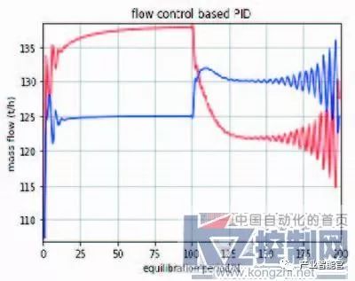 热网系统是由数量庞大的管段串联或并联组成,任一管段或支路的调节变化,都将引起整个系统阻力状况的变化,从而影响各支路的流量变化。换热站自动化改造后,一次网各支路通常装有流量调节装置及控制器,各支路通过控制器调节此装置以实现所需的供回水温度。温度的调节本质上是对一次网流量的调节,目前普遍采用常规PID控制器进行自动调节。热网中大量支路投入自动后,各支路的控制目标变化时,自主调节系统平衡被打破,系统会产生长时间的扰动甚至震荡,造成失稳,使加快调节阀等设备受到磨损,降低设备的可靠性。如图4、5所示,仿真程序模拟了两个支路间控制目标改变而引起的系统失稳现象。由于管网阻力特性,当系统从一个平衡态切换到另一个态的过程中,任何支路的扰动都会对其它支路产生影响。当系统由几十甚至上百个支路组成时,系统的控制调节显然会更加困难。