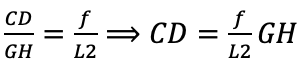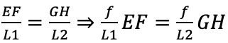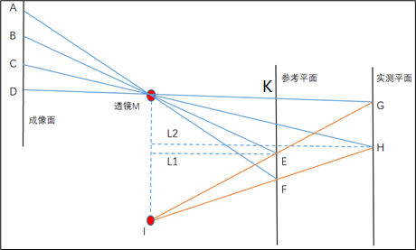 为了详细解释这个平移不变性,图15是一个典型的散斑结构光成像系统的原理图,图中I是激光散斑发射器,假设它投影的两条射线IG 和IH 为投影散斑的两个斑点,它在反射面1 和反射面2 上的两个斑点之间的距离分别为EF 和GH,EF 在成像面上对应的斑点像的距离为AB,GH 在成像面上的对应的斑点像的距离为CD。假定反射面1和反射面2与相机的垂直距离分别为L1和L2,相机焦距为f,基线MI为b。