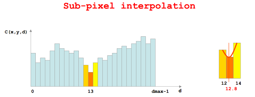 最后再简单介绍一下视差细化。通常情况下,我们在经过上面介绍的3步(匹配代价计算→代价聚合→视差计算)后得到的视差是像素级的精度,但是有些应用我们希望能达到亚像素级精度 [8][9],这样我们就需要对得到的视差做细化(refinement),最常见的细化操作就是二次插值。