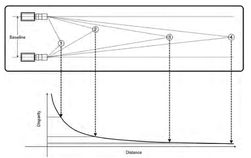 这就是基本的双目三角法原理,从上面的公式可知,视差(disparity)与距离(distance)Z成反比,如下图所示: